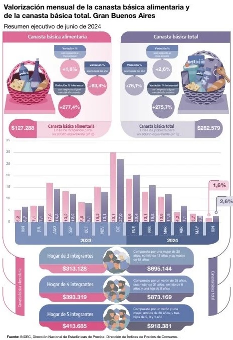Al mismo tiempo una familia tipo en la zona metropolitana necesitó en junio $873.169 para no ser pobre y el mismo hogar de cuatro integrantes en el AMBA requirió $393.319 cubrir sus necesidades básicas de alimentación y superar la línea de indigencia.