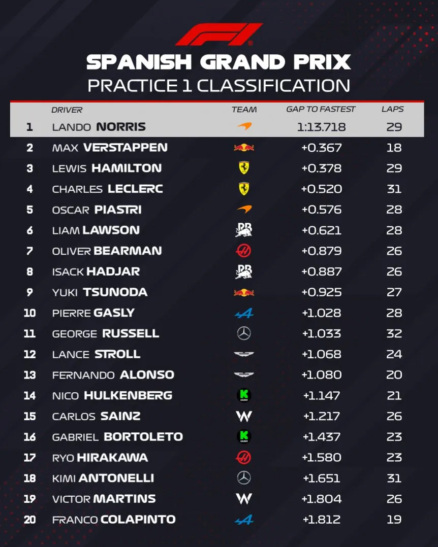 Franco Colapinto debió abandonar la primera práctica libre del Gran Premio de España por problemas con la unidad de potencia de su Alpine. A falta de 15 minutos para el cierre, el argentino entró repentinamente a boxes con una pequeña llama en la parte trasera del monoplaza. Los bomberos recurrieron al box, pero el inconveniente fue mínimo y lo pudieron resolver los propios mecánicos, que posteriormente retiraron el auto para su posterior revisión. Finalizó último, a 1.812 segundos de Lando Norris, el mejor de la sesión.