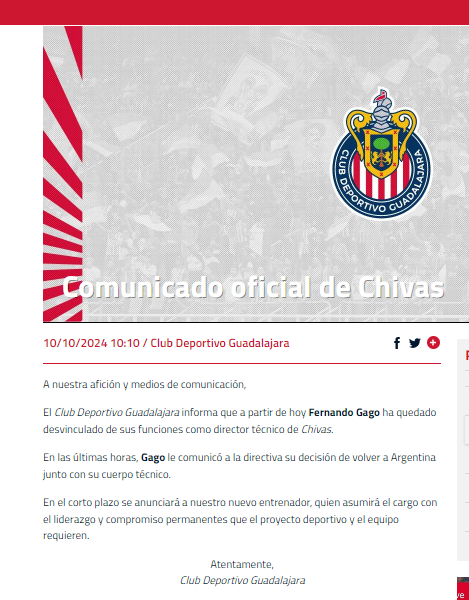 A través de un comunicado publicado en su página web, Chivas confirmó la noticia de la partida de Gago, que le ratificó que su intención es regresar a la Argentina. "El Club Deportivo Guadalajara informa que a partir de hoy Fernando Gago ha quedado desvinculado de sus funciones como director técnico de Chivas", arranca el comunicado del conjunto mexicano. "En las últimas horas, Gago le comunicó a la directiva su decisión de volver a Argentina junto con su cuerpo técnico", completa la información brindada por Chivas, que indicó que en breve anunciará al reemplazante del técnico argentino..
