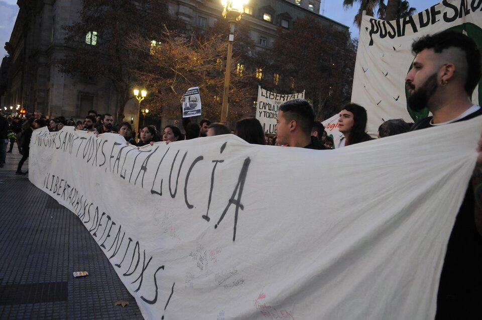 "No cursamos todxs. Falta Lucía. Libertad a todxs lxs detenidxs". La enorme bandera que hicieron los compañeros de Lucía Puglia, que en ese momento debería haber estado cursando Letras en la Universidad Nacional de Hurlingham y que en la noche del martes fue recibida por sus familiares en Ezeiza, encabezó la ronda espontánea que, al finalizar el acto, los manifestantes emprendieron alrededor de la pirámide. Una de las jóvenes que la llevaba era Aylen, la mejor amiga de Lucía, que confió la historia de terror que le contó su amiga cuando pudo visitarla unos minutos.