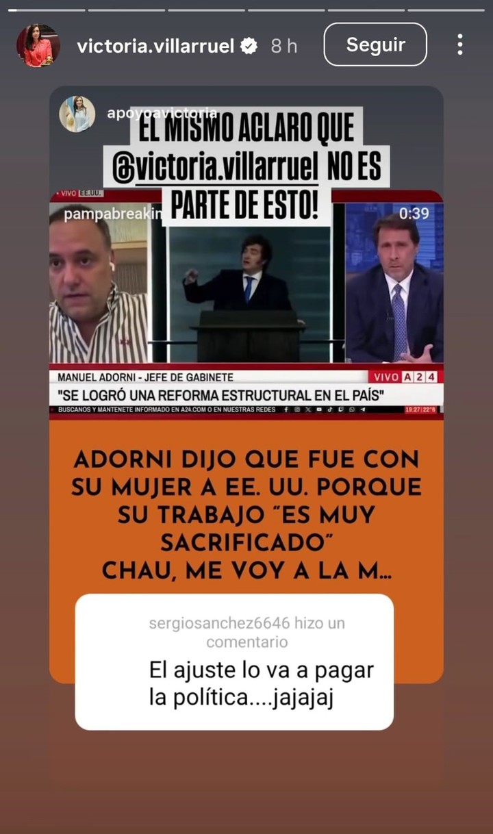 A su vez, esa publicación fue una respuesta a un flyer generado desde @apoyoavictoria, una cuenta simpatizante de la vicepresidenta. En esa imagen se lo ve a Adorni durante la entrevista en la que intentó defender el viaje de su mujer.