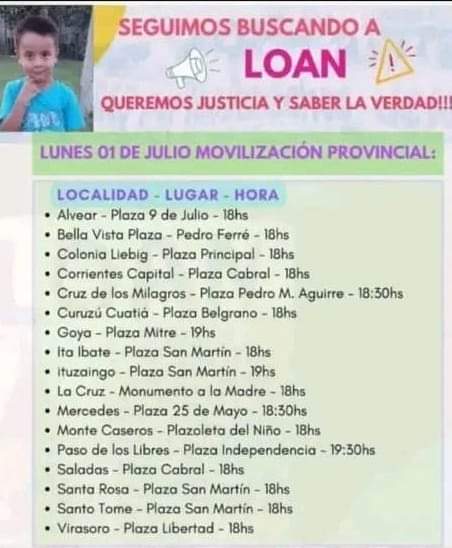 Este lunes 1° de julio se llevarán a cabo casi de manera simultánea diferentes concentraciones y movilizaciones en no menos de 17 localidades del territorio provincial bajo la consigna “Seguimos buscando a Loan. Queremos justicia y saber la verdad”. Con respecto al caso, la Justicia Federal apartó a la Policía de Corrientes de la investigación y la ministra de Seguridad de la Nación sostuvo que "no se tienen datos nuevos”.