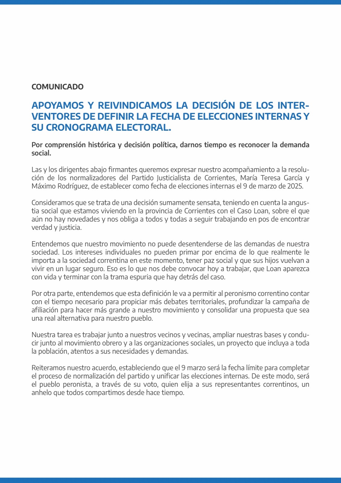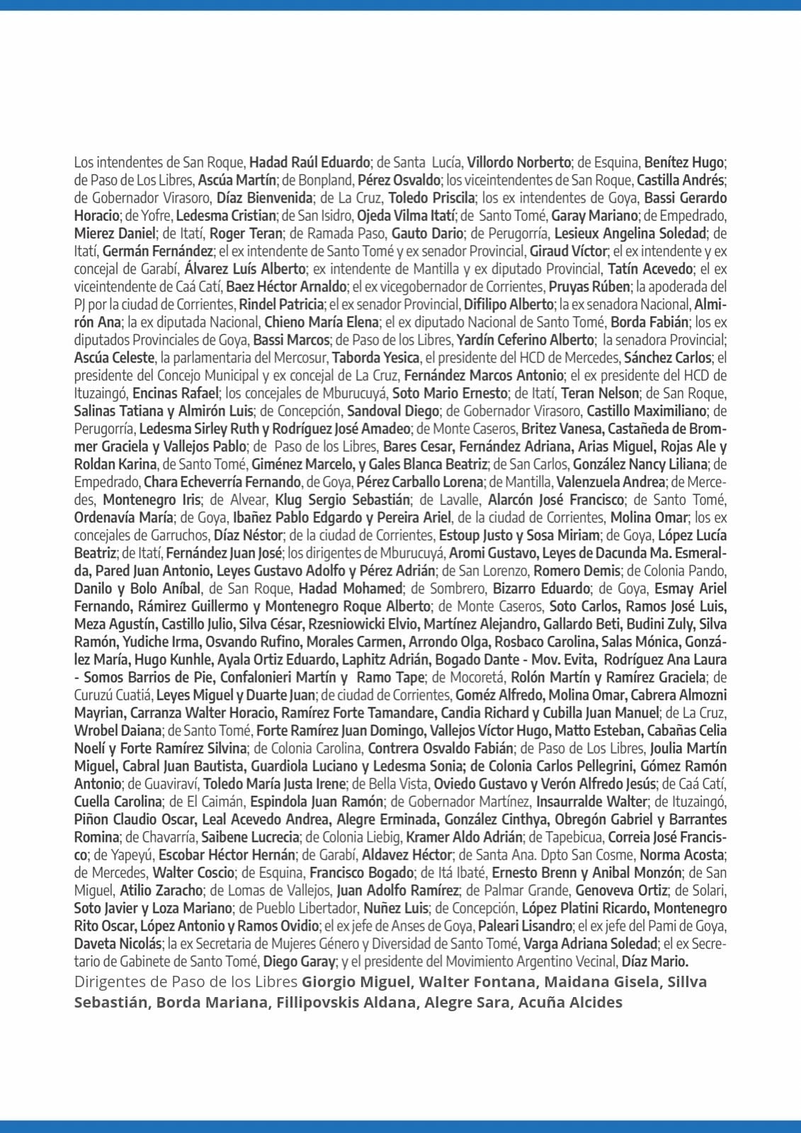 "Por eso queremos reiterar nuestro pleno acuerdo con la determinación a cargo de los interventores. Ahora es el momento de construir esa alternativa para proponer un proyecto que enamore a todas y a todos los Correntinos", cierra el comunicado firmado por cientos de dirigentes provinciales del partido Justicialista de toda la provincia.