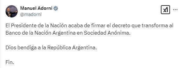 La medida fue anticipada poco antes por el vocero presidencial, Manuel Adorni, en sus redes sociales. "El Presidente de la Nación acaba de firmar el decreto que transforma al Banco de la Nación Argentina en Sociedad Anónima. Dios bendiga a la República Argentina. Fin.", posteó.