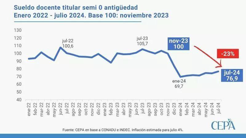 El salario docente sufrió una fuerte caída, que supera el promedio de casi todas las retracciones del resto de las versiones de salarios. Entre noviembre 23 y mayo 24, es decir bajo la gestión de Milei, el salario docente registra uno de los peores números de retroceso: