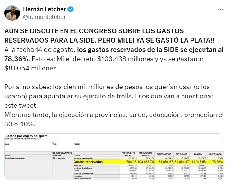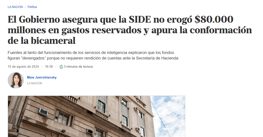 - Rechazo del DNU 656/2024, emitido el 23 de julio, que había aumentado el presupuesto en gastos reservados para la SIDE en 100.000 millones de pesos. En pocos días, y sin tratamiento por la Comisión Bicameral de Inteligencia de DNU, fue devengado al 79% y, el martes 20 de agosto, ejecutados esos fondos. En sesión especial citada para el miércoles 21, el DNU fue rechazado por la Cámara de Diputados con una mayoría simple de 156 votos. Resta la misma acción por parte del Senado. Adicionalmente, esta misma semana, en la Bicameral fueron elegidos el senador Martín Lousteau (UCR) como presidente, el diputado Leopoldo Moreau como vicepresidente y el senador Oscar Parrilli (UP) como secretario, quitándole a La Libertad Avanza (LLA) y el PRO el manejo de esta agenda.