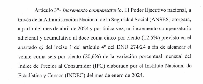 En primer lugar, la nueva ley aprobada por las dos cámaras plantea un incremento compensatorio adicional de 8,1 puntos (equivalente a 7,2% acumulativo). Este aumento es una compensación por inflación pasada no reconocida. Cuando el Presidente Milei firmó el decreto que actualizó las jubilaciones por inflación en marzo, y frente al reclamo por “olvidarse” de actualizar por la inflación de enero (que había arrojado 20,6%), incorporó sólo 12,5%. El diferencial es lo que la nueva ley establece que debe abonarse.