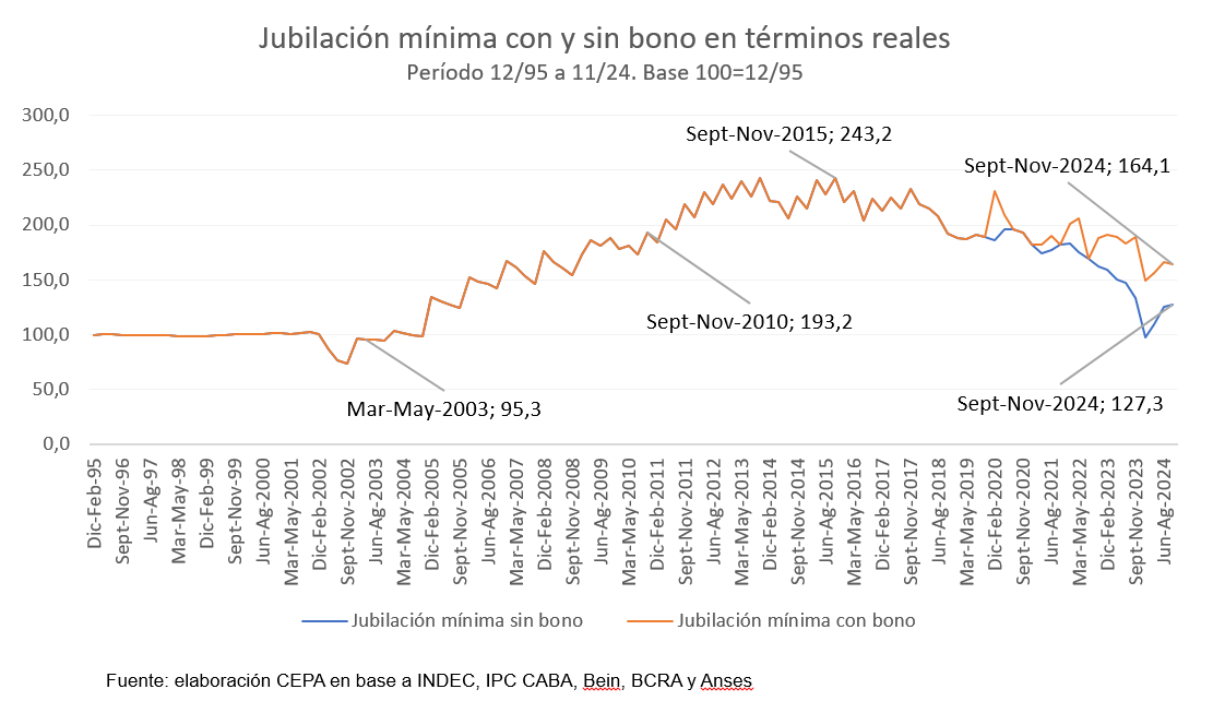 - el inicio de la gestión de Milei significa un rápido retroceso de los haberes (-26,3% para las jubilaciones sin bono y -21,3% para las que tienen bono), al punto tal que se ubicaron, en ese momento, 3% por debajo del poder adquisitivo del promedio de la década del ‘90;