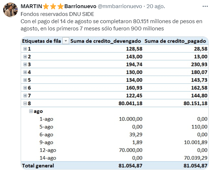 La sospecha sobre el rápido uso de estos fondos es aún más fuerte: el devengamiento se produce en dos días específicos, con montos redondos: el 1 de agosto por 10.000 millones y el 12 de agosto por 70.000 millones, tal como publicó Martín Barrionuevo. ¿Qué pudo haber costado 70.000 millones redondos en un día? Difícil de explicar.
