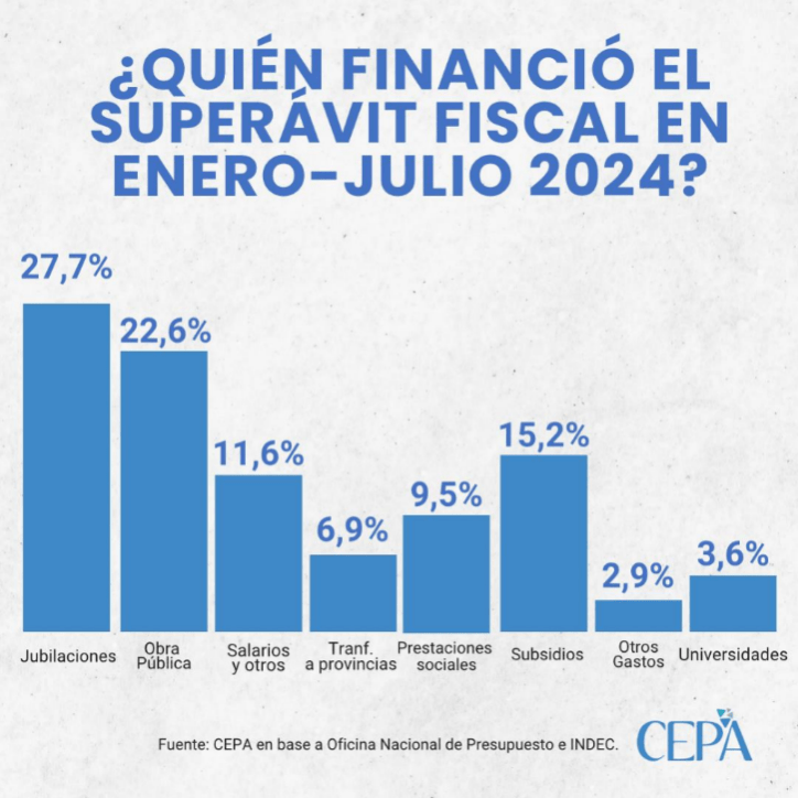 Por último, el dato que desde CEPA publicamos: el superávit fiscal se explica, en el acumulado enero-julio de este año, en un 27,7% por la reducción de las jubilaciones.