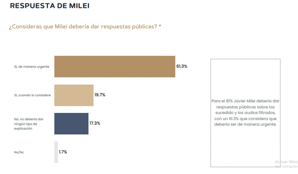 En esta postura es posible que haya tenido un fuerte impacto la respuesta de la Casa Rosada que osciló entre el silencio y argumentos poco sostenibles, como el mencionado de armados opositores. Les jugó en contra que hasta un periodista cercano a LLA, como Alejandro Fantino, haya advertido públicamente que “estaban robando”; “ojo con Lule” o “hay genética de deshonestidad” en referencia los primos Menem. Que haya transcurrido una semana entera desde la difusión de los audios sin que Javier y Karina Milei hayan ensayado una defensa, los deja expuestos. Y es entendible, por esa razón, que el 61,3 por ciento haya opinado que Milei tiene que dar respuesta de manera urgente. Sólo aparece el sólido núcleo duro del 17,3 por ciento que afirma que “no, no debería dar ningún tipo de explicación”.