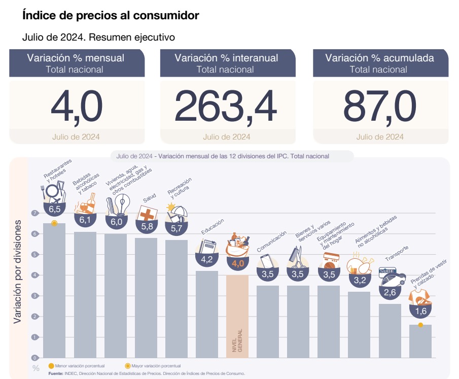A nivel nacional el Índice de Precios al Consumidor (IPC) del mes de julio fue del 4%; durante el años 2024 fue del 87% y la inflación de los últimos 12 meses fue del 263,4%