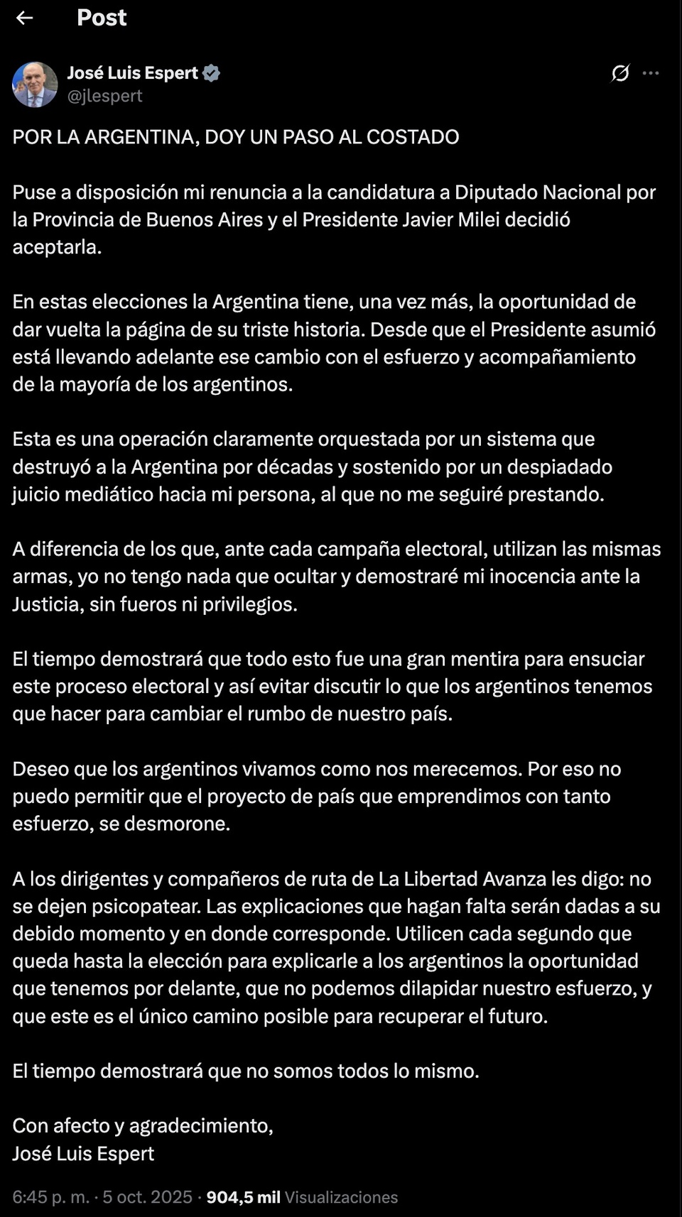 Tras el escándalo que lo rodea en torno a su vínculo con Fred Machado, acusado de narcotráfico en Estados Unidos, y a tan solo 20 días de las elecciones, Espert expresó su decisión de "dar un paso al costado". Su salida deja vacante una candidatura clave en la provincia de Buenos Aires, el distrito más grande y disputado del país, y golpea directamente la estrategia electoral del oficialismo.