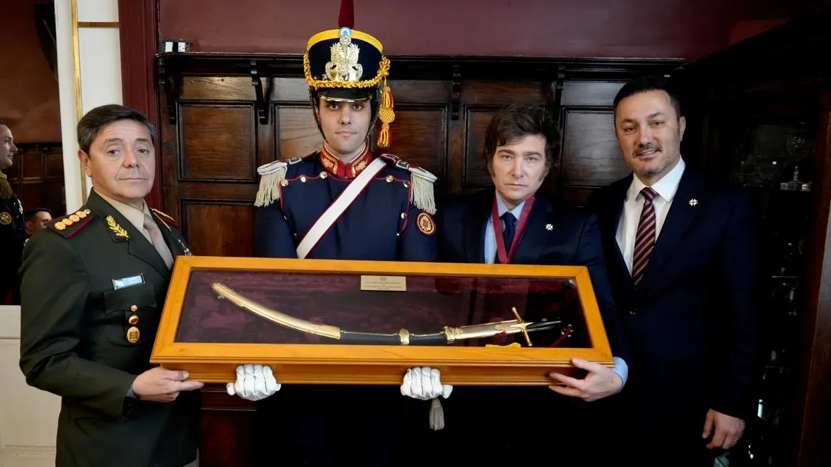 El título que otorgado a Milei fue el de Caballero Granadero, con el grado de Gran Oficial. La foto distribuida a la prensa muestra al presidente emocionado al recibirlo, en un acto en el que participaron el ministro de Defensa, Luis Petri, la secretaria de la presidencia Karina Milei y el jefe del Ejército, general de división Carlos Alberto Presti.