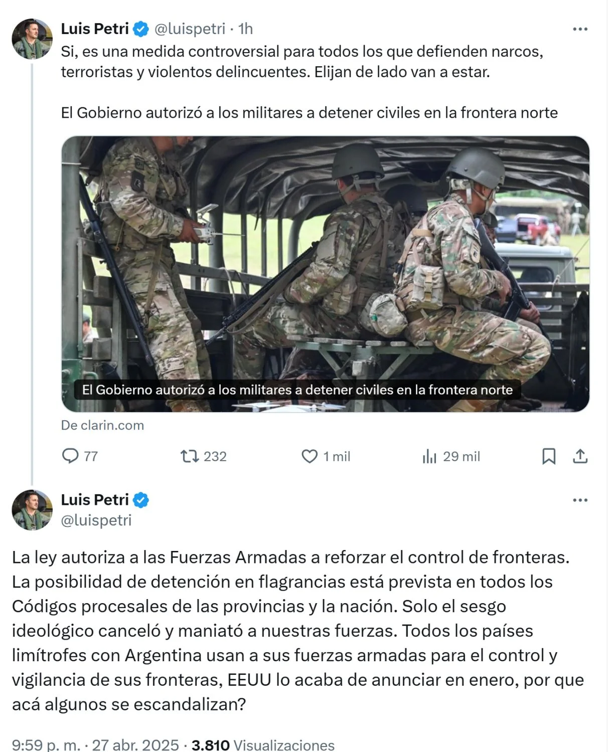 El ministro defendió la aplicación del cambio en materia de seguridad nacional al argumentar que la posibilidad de cursar "detenciones en flagrancias" está prevista en todos los códigos procesales provinciales y en el nacional. "Solo el sesgo ideológico canceló y maniató a nuestras fuerzas", se jactó Petri en X y remató: "Todos los países limítrofes con Argentina usan a sus fuerzas armadas para el control y vigilancia de sus fronteras, EEUU lo acaba de anunciar en enero, por que acá algunos se escandalizan?".