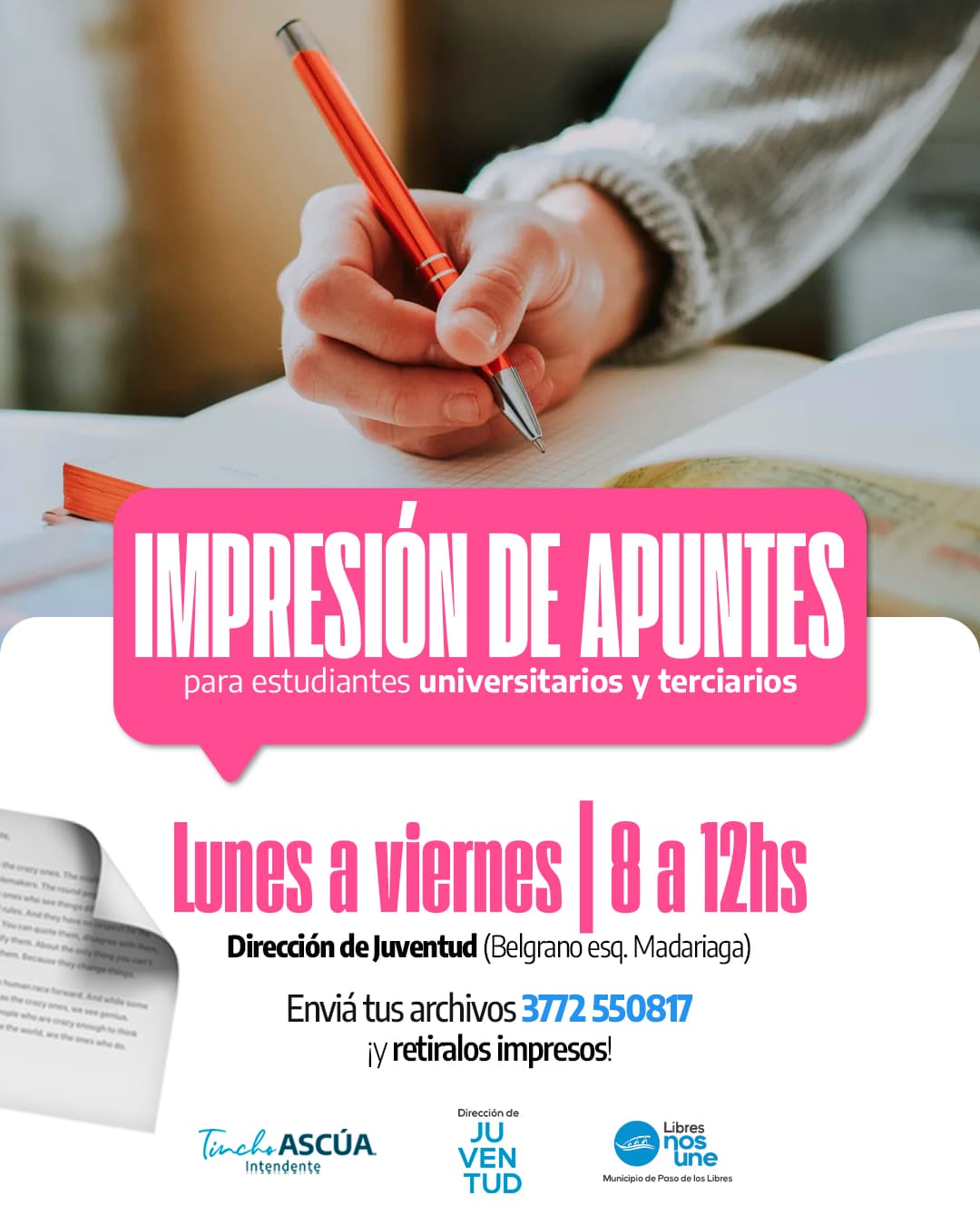 El Municipio de Paso de los Libres, a través de la Dirección de Juventud, continúa brindando el servicio gratuito de impresión de apuntes para estudiantes de nivel universitario y terciario.