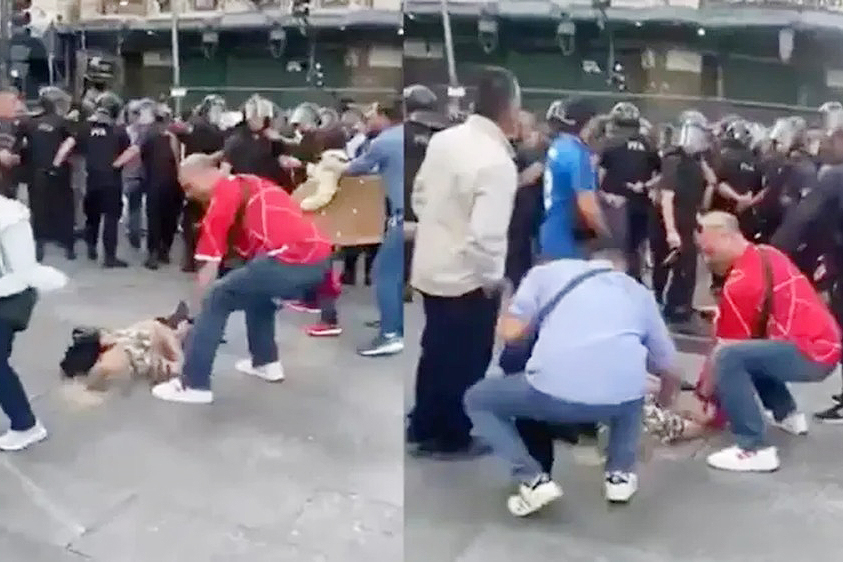 Blanco caminaba con un bastón. En segundos, el bastón quedó en el aire y ella en el suelo. La caída le provocó un golpe en la cabeza que requirió atención médica. Las imágenes registraron la secuencia completa y terminaron siendo más elocuentes que cualquier versión oficial.