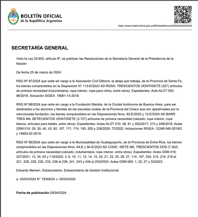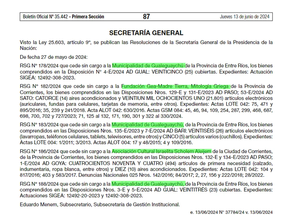 “El Jefe” se saltó este protocolo que si bien no está legalizado, garantiza transparencia y eficiencia. Entre abril y mayo de 2024 y en el Boletín Oficial, donde debe quedar el registro de las donaciones, pueden encontrarse 21 resoluciones que llevan la firma de la Secretaria de la Presidencia pero también de Natalia Soledad Aprile, directora general de Programas de Gobierno, y Eduardo “Lule” Menem, subsecretario de Gestión Institucional.