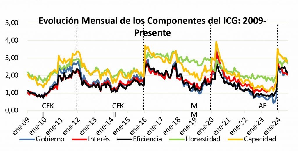 El índice se construye sobre la base de operacionalizar el relevamiento de cinco variables: la imagen o evaluación general del gobierno, la percepción sobre si se gobierna pensando en el bien general o en el de sectores particulares, la eficiencia en la administración del gasto público, la honestidad de sus miembros y su capacidad para resolver los problemas del país. Allí el gobierno exhibe un mejor desempeño en lo que se refiere a la capacidad y la honestidad mientras que su desempeño se deteriora en lo que hace a la visión general del gobierno y su interés en resolver los problemas de los sectores populares. En el medio se ubica la eficiencia.