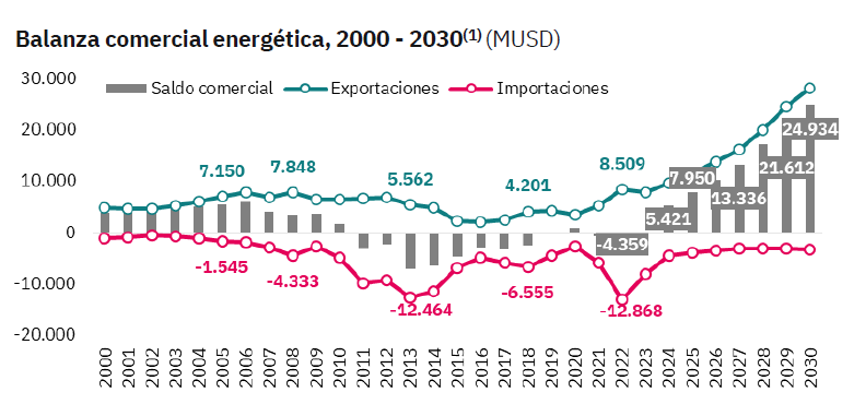 Según E&E, una proyección más moderada, “base”, supondría una balanza comercial positiva algo inferior a los USD 20.000 millones para 2030. Una previsión “ácida”, que suponga que no se concentran las inversiones necesarias, pondría el saldo positivo en torno a los USD 10.000 millones en cinco años.