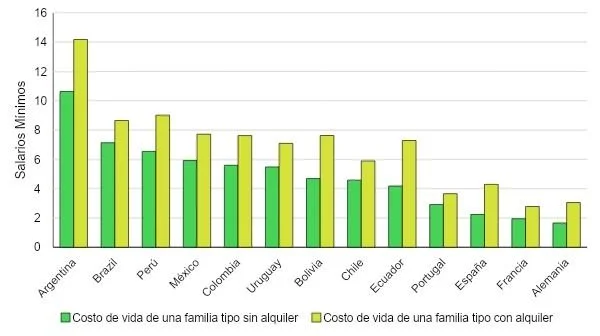 Si se evalúa nuestra posición respecto a los países seleccionados de la Unión Europea, se puede concluir que la diferencia en costo de vida es aún mayor ya que, una persona requiere 2,5 salarios mínimos menos para acceder a una canasta de consumo básica y 3,5 salarios mínimos menos si se considera el alquiler de un monoambiente en la Ciudad. El costo de vida promedio de una persona en Argentina es de casi 5 salarios mínimos. Si se descuenta el alquiler se reduce a 3 salarios mínimos. Si se evalúa el costo de vida de una familia tipo (pareja con dos hijos) en Argentina, se necesitan más de 14 salarios mínimos para poder adquirir bienes y servicios básicos y pagar el alquiler de un departamento de tres ambientes en la ciudad.