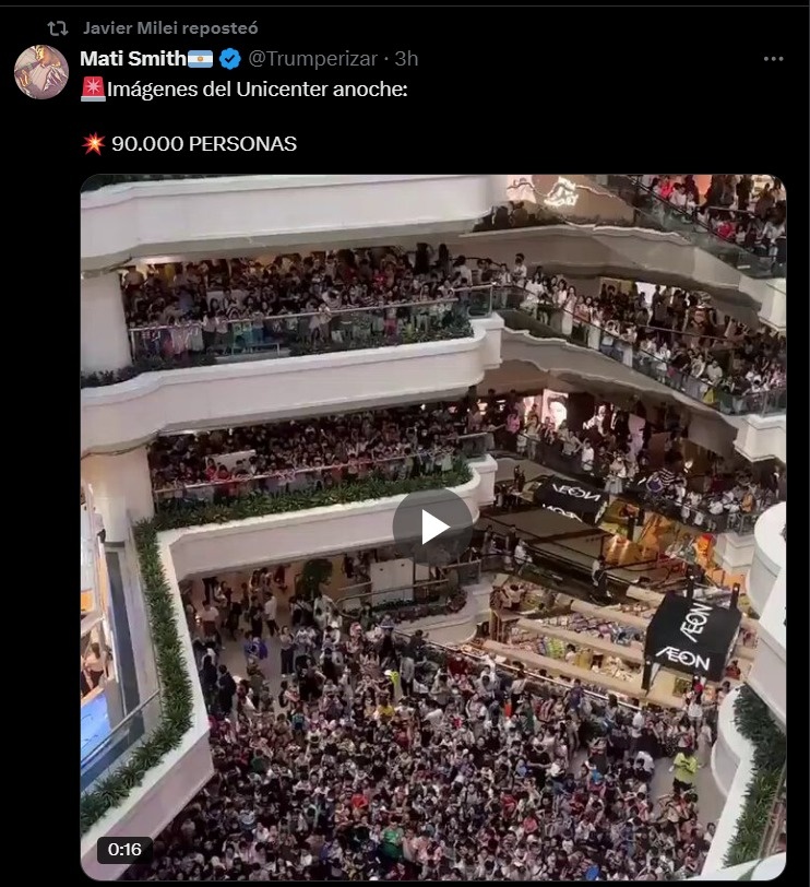 Durante la nochebuena el presidente Javier Milei volvió a sus papelones tuiteros, al compartir una imagen que supuestamente mostraba el Shopping Unicenter de Martínez abarrotado de compradores en vísperas de Navidad. En su publicación en la red social X, Milei reposteó que "90.000 personas" estaban presentes en el centro comercial, intentando resaltar la reactivación económica en un contexto festivo.