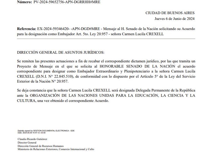 La aparición del pliego con el que el Gobierno nominaría a Crexell para ocupar la silla en la Unesco, a horas de la negociación, confirmó todos los entretelones. En principio se difundió que se trataba del proyecto ya ingresado a la Cámara alta. Sí, el Senado debería aprobar la designación de la legisladora neuquina, lo que implicaría cerrar un acuerdo a favor de las leyes del gobierno. Sin embargo, se aclaró luego que se trataría solo de una nota interna de la Cancillería.
