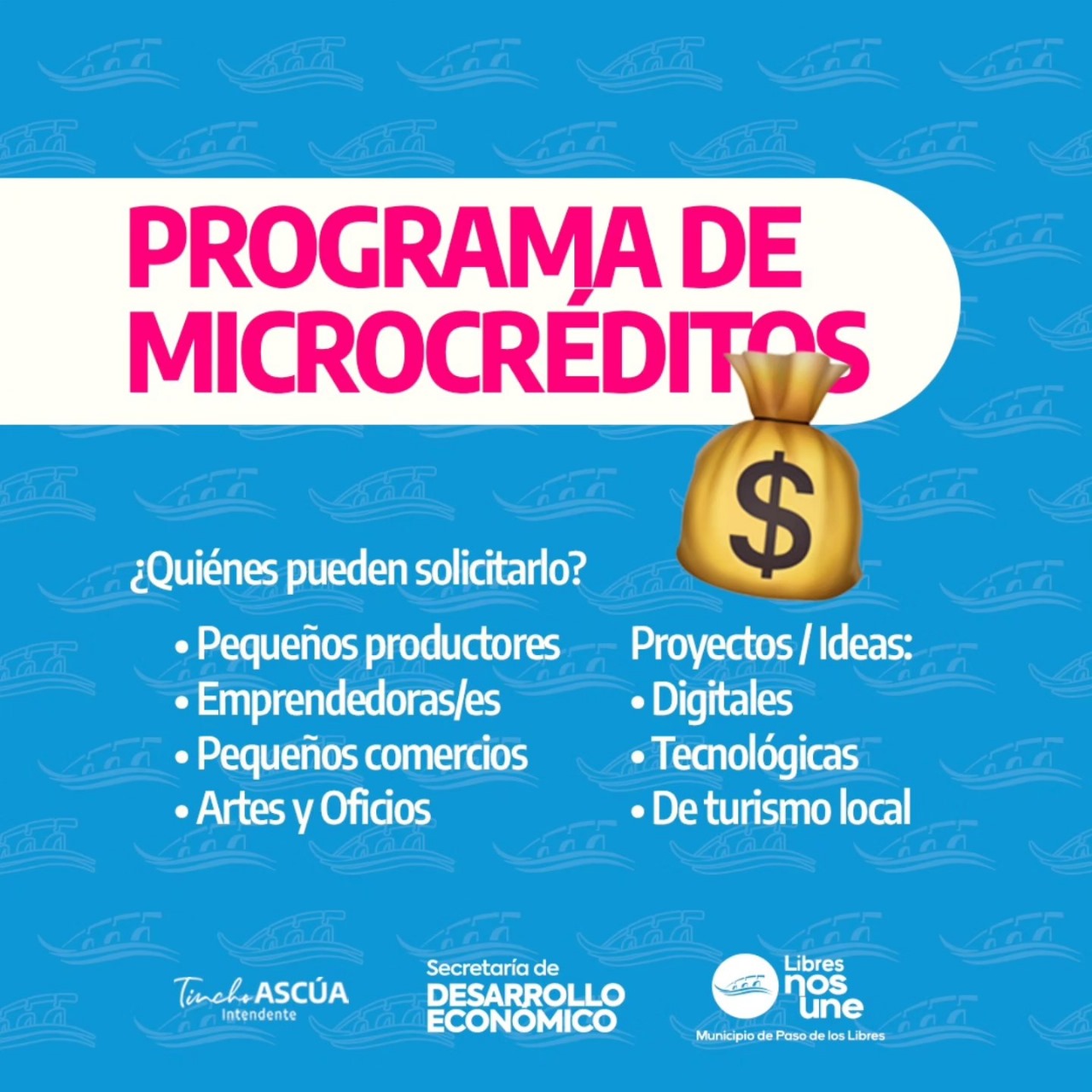 El Municipio de Paso de los Libres creó un programa de microcréditos destinado a pequeños productores, emprendedores, comerciantes y aquellos que realicen sus actividades de artes y oficios. Quienes deseen acceder a este beneficio deberán ser mayores de 18 años e inscribirse en el Registro Municipal de Microcréditos, entre otros requisitos.