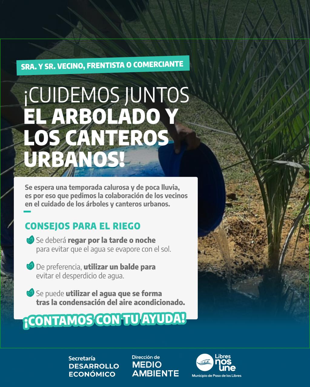 La Dirección de Medio Ambiente de Paso de los Libres lanzó una campaña para fomentar la participación de los vecinos en el cuidado del arbolado y los canteros urbanos durante la temporada de primavera y verano. Dado que se espera un clima caluroso y con escasa lluvia, la iniciativa busca evitar que el arbolado urbano sufra daños debido a la falta de riego.