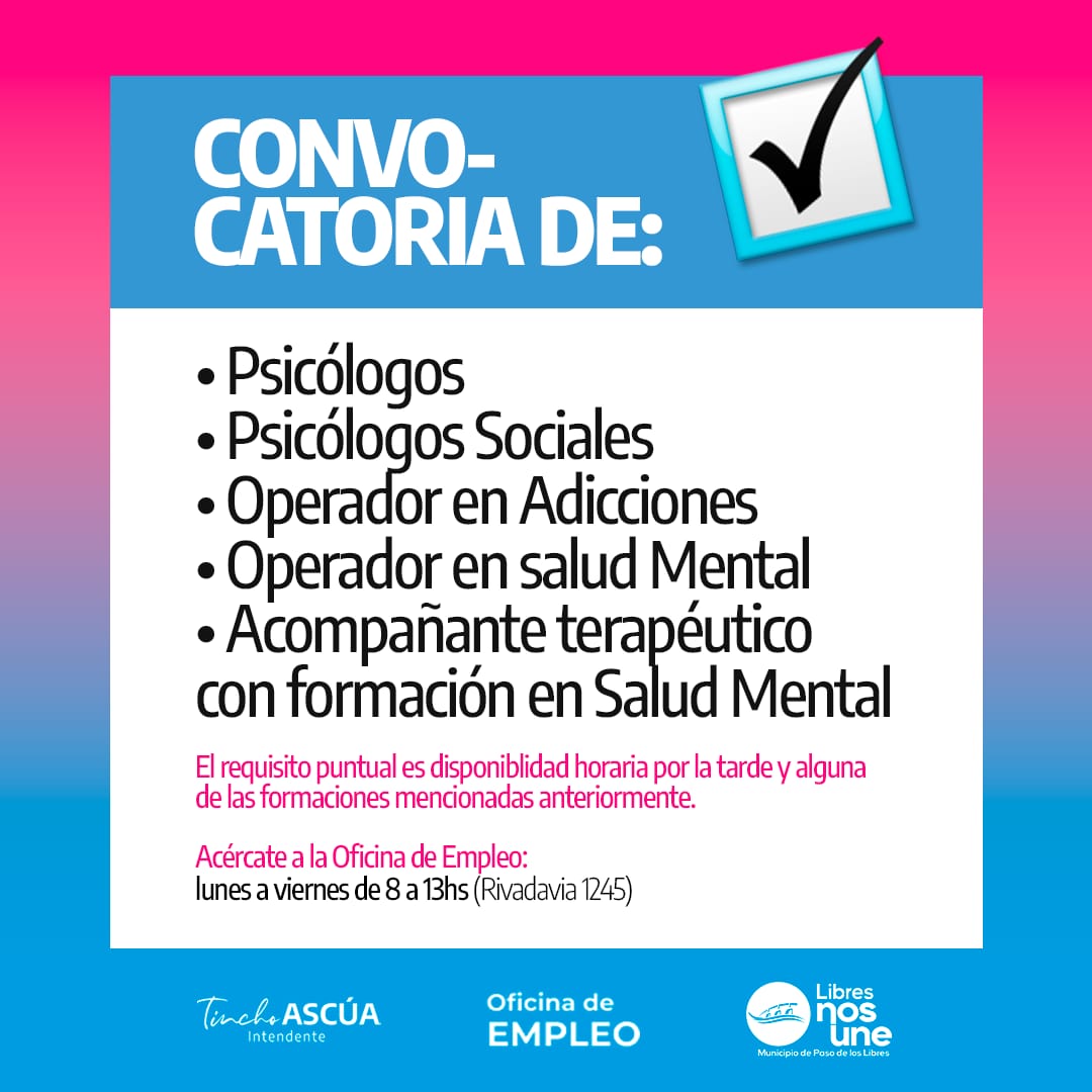 El Municipio de Paso de los Libres, a través de su Oficina de Empleo, abrió una convocatoria dirigida a profesionales de la salud mental y áreas relacionadas. Los perfiles requeridos incluyen psicólogos, psicólogos sociales, operadores en adicciones, operadores en salud mental y acompañantes terapéuticos con formación en salud mental.