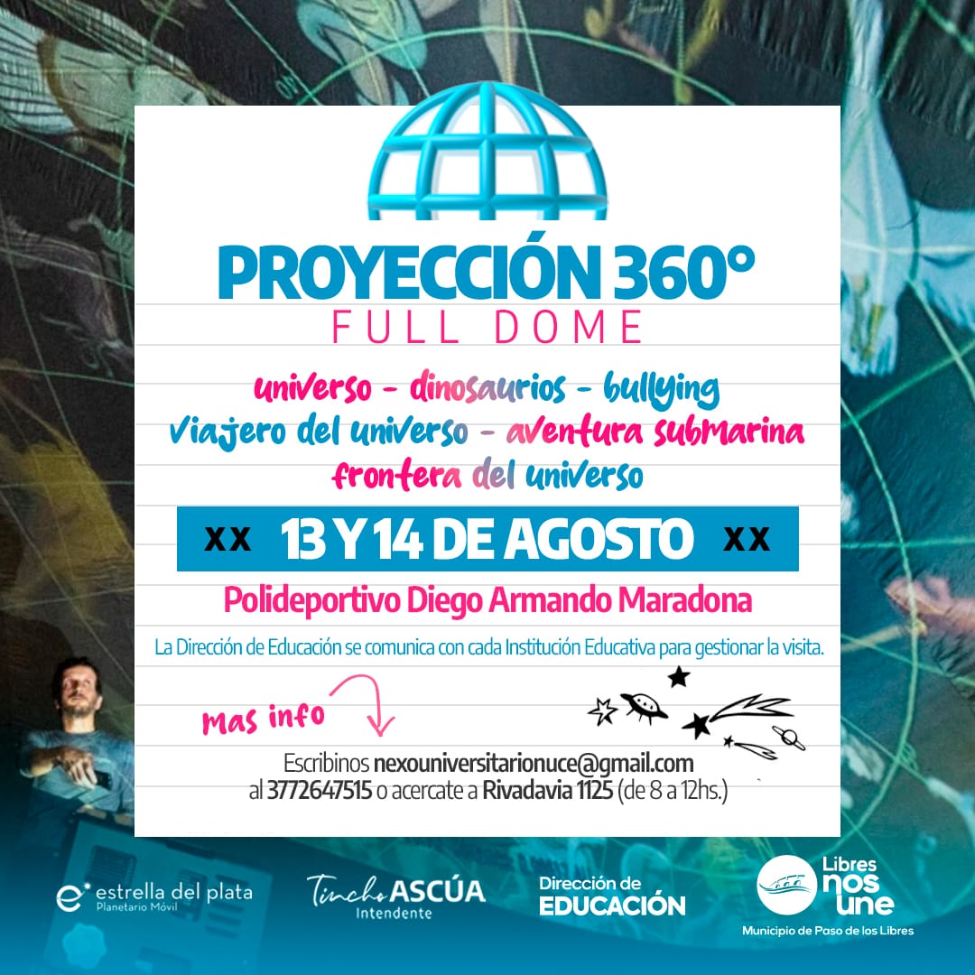 El próximo 13 y 14 de agosto, el Polideportivo Diego Armando Maradona de Paso de los Libres se transformará en un espacio de aprendizaje interactivo con la llegada del Planetario Móvil. Este evento educativo ofrecerá a los estudiantes la oportunidad de sumergirse en proyecciones 360° full dome, abarcando temas como el universo, los dinosaurios, el medio ambiente, el bullying y la aventura submarina.