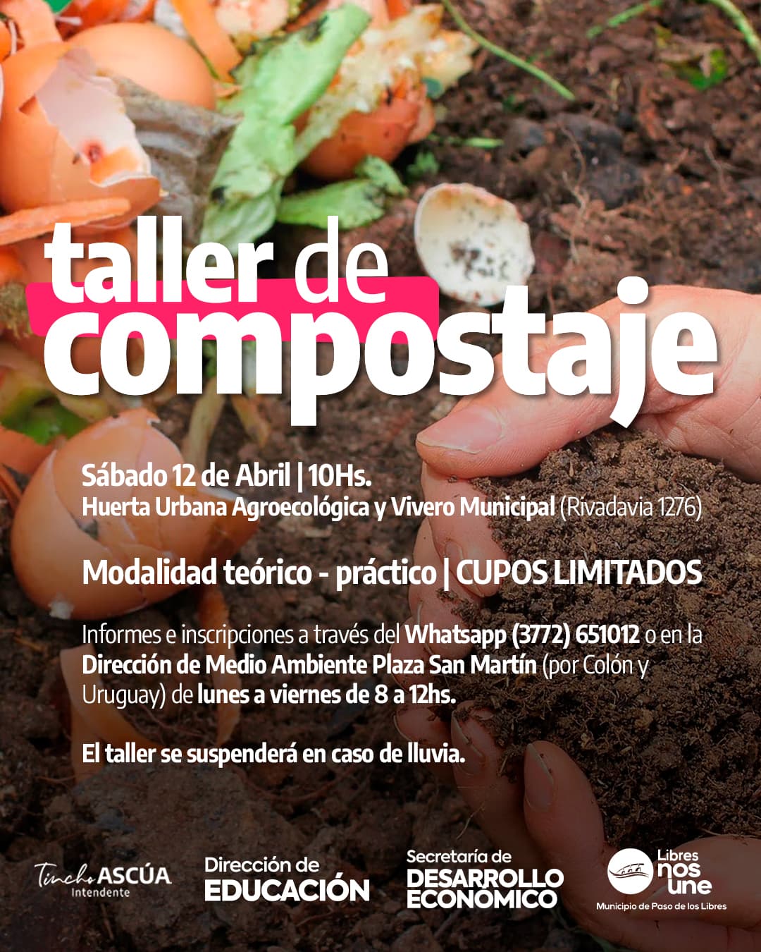 El Municipio de Paso de los Libres invita a participar del taller de compostaje que se realizará el sábado 12 de abril, a las 10:00 horas, en la Huerta Urbana Agroecológica y Vivero Municipal, ubicada en Rivadavia 1276. La actividad se desarrollará bajo modalidad teórico-práctica y contará con cupos limitados.