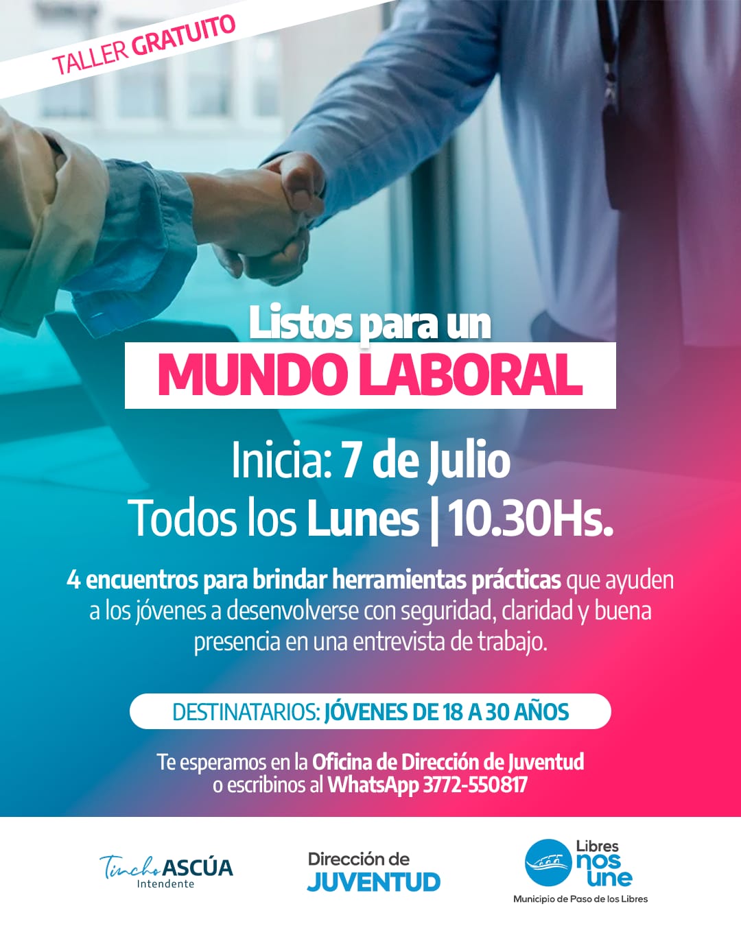 El Municipio de Paso de los Libres, a través de la Dirección de Juventud, informa que el próximo 7 de julio comenzará el taller “Listos para un mundo laboral”, una propuesta destinada a jóvenes de entre 18 y 30 años con el objetivo de brindar herramientas prácticas para enfrentar entrevistas de trabajo con mayor seguridad y claridad.