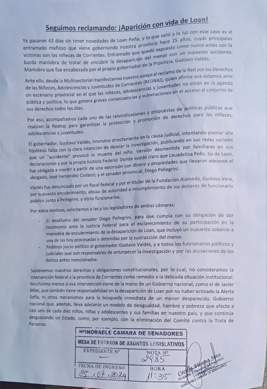 anunciaron y presentaron ante la Cámara de Senadores de Corrientes la solicitud formal de “desafuero del senador provincial Diego Pellegrini” y que preste colaboración activa con la Justicia Federal para encontrar sano y salvo a Loan Peña y esclarecer el hecho investigado.