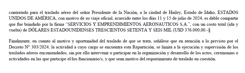 Con el avión presidencial ARG-01 en mantenimiento, Javier Milei contrató un charter privado para ir la cumbre de multimillonarios conocida como "campamento de verano" de Sun Valley. La Secretaría General de la Presidencia le abonó 376 mil dólares a la empresa Servicios y Emprendimientos Aeronáuticos S.A. (Flyzar). No fue la única erogación a cargo del Estado.