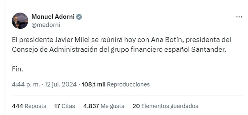 La única cita que confirmó Adorni fue con Ana Botín, del grupo Santander. Si bien Diana Mondino no viajó, la Cancillería fue la encargada de coordinar los encuentros. "La agenda oficial fue concertada por el Ministerio de Relaciones Exteriores de acuerdo a parámetros de confidencialidad internacionales de este tipo de encuentros", respondió la Secretaría General de la Presidencia al requerimiento de este medio.