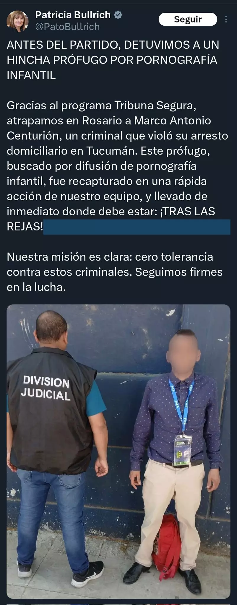 “Gracias al programa Tribuna Segura, atrapamos en Rosario a Marco Antonio Centurión, un criminal que violó su arresto domiciliario en Tucumán. Este prófugo, buscado por difusión de pornografía infantil, fue recapturado en una rápida acción de nuestro equipo, y llevado de inmediato donde debe estar: ¡Tras las rejas! Nuestra misión es clara: cero tolerancia contra estos criminales. Seguimos firmes en la lucha”, escribió en su cuenta de la red social X.