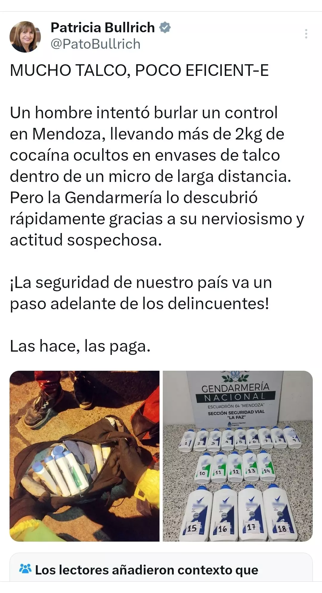 “Mucho talco, poco efficient-e”, posteó más tarde la ministra de Seguridad en sus redes sociales para celebrar la detención. Luego, 21 días más tarde, se comprobó que lo incautado no era droga sino, efectivamente, talco para pies por lo que el hombre fue liberado y el caso, cerrado.