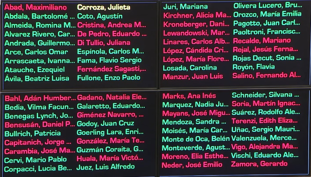 Por la negativa, votaron los 23 peronistas del interbloque Popular; los radicales Maximiliano Abad y Daniel Kroneberger; Andrea Cristina y Victoria Huala, del Pro; la chubutense y presidenta de la Comisión de Ambiente y Desarrollo Sustentable, Edith Terenzi; la cordobesa Alejandra Vigo, de Provincias Unidas; y los santacruceños José María Carambia y Natalia Gadano.