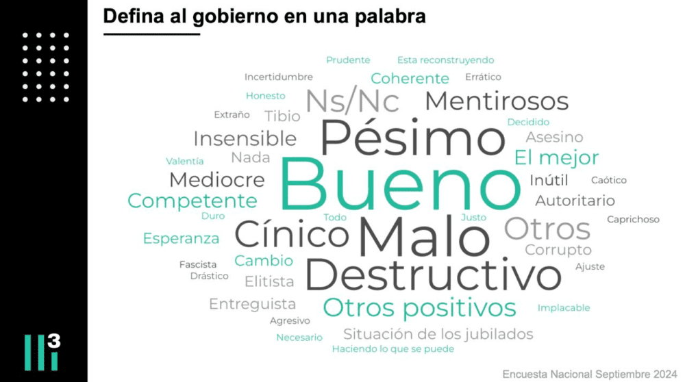 La caída de Milei se consolidó en septiembre. Un estudio de Casa Tres, la consultora que dirige Mora Jozami, hace una disección en diagonal del apoyo y rechazo al presidente. Jozami pidió describir al Gobierno con una palabra y encontró un fenómeno curioso: solo 30% usa referencias positivas, a pesar que la aprobación se ubica en 43 puntos. Es decir: hay un grupo numeroso que aprueba la gestión pero no menciona aspectos positivos del Ejecutivo. Del otro lado, el tenor de la negatividad tiene, según Jozami, “mayor profunidad y consistencia”. “Mientras el rechazo se está radicalizando, pareciera que para los que aprueban es más difícil encontrar adjetivos positivos para destacar”, completa.