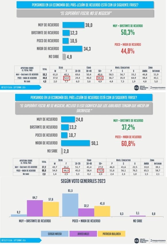 El veto potenció ese comportamiento. Un estudio de Shila Vilker, para TresPuntoZero y Grupo de Opinión Pública de Raúl Timerman, lo muestra con claridad. Un 50% defiende la idea de superávit fiscal innegociable que expone Milei, pero cuando se vincula el concepto con el sacrificio de los jubilados, el respaldo baja 13 puntos y pega más entre votantes de Bullrich, los electores de más edad y las mujeres.