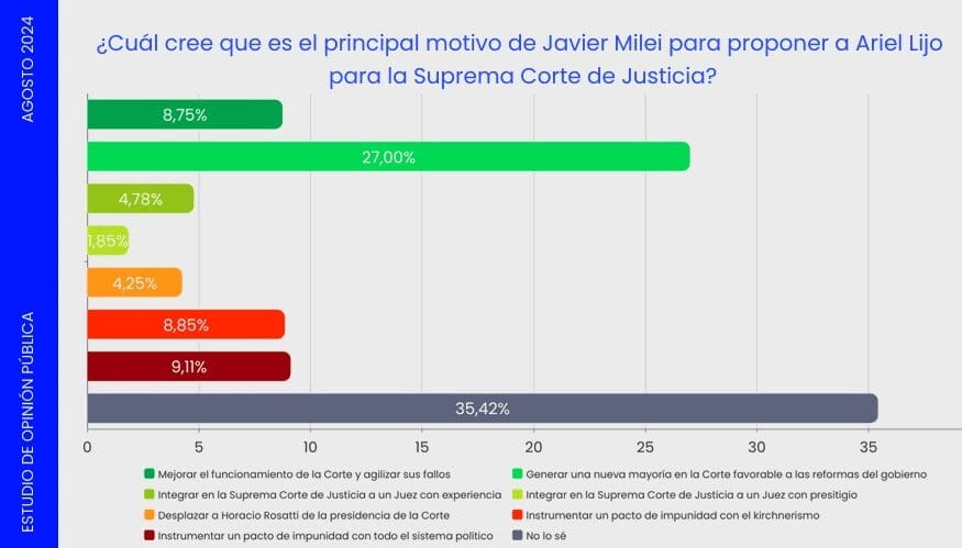 Escenarios de Federico Zapata y Pablo Touzón sobre Lijo: 50% no tiene opinión, en el resto el rechazo es 4 a 1. Sobre las razones de la postulación, 35% no sabe, menos de 15% ve razones nobles y 48% cree que es para tener una Corte adicta, pactar con la política o el kirchnerismo, o correr a Horacio Rosatti. Antes de fin de mes la Corte elegirá presidente. Todo indica que reelegirá Rosatti, aunque un mes atrás circuló la versión de que podría existir un acuerdo para que el lugar lo ocupe otra vez Carlos Rosenkrantz. Hoy, eso parece descartado.