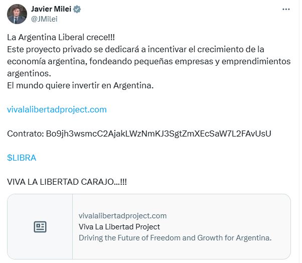 "La Argentina Liberal crece!!! Este proyecto privado se dedicará a incentivar el crecimiento de la economía argentina, fondeando pequeñas empresas y emprendimientos argentinos. El mundo quiere invertir en Argentina", tuiteó Milei y fijó la publicación en su cuenta. En el posteo compartió una página con un diseño digno de un escolar con el nombre https://www.vivalalibertadproject.com/.