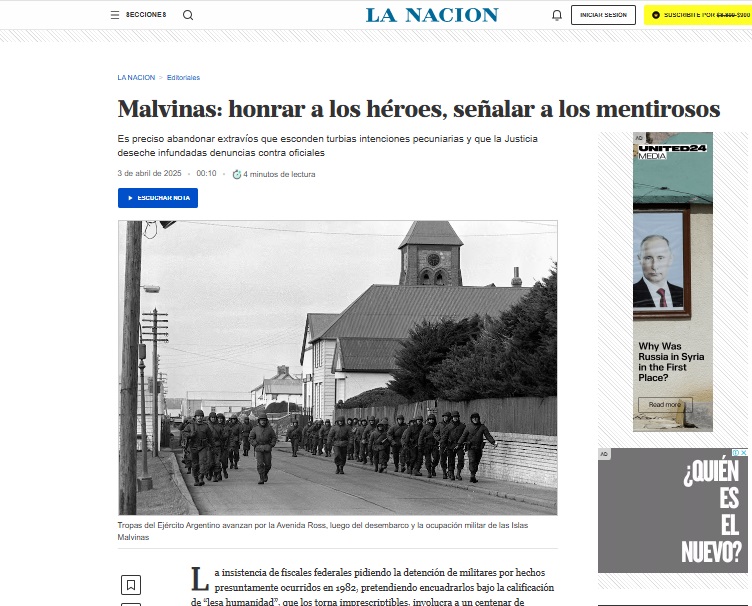 El Diario La Nación nos dedicó una nueva editorial, creo que vamos por la octava, a los que denunciamos las torturas sufridas por los soldados argentinos en las Islas Malvinas y buscamos Justicia. Le molestó el reciente fallo de la Camara de Casación que advierte la responsabilidad internacional del Estado por la existencia de Tratados de DDHH y remite el caso a la Corte Suprema, donde hace más de 4 años duermen varios expedientes sobre el tema, provocando una morosidad que se burla de la expectativa de las víctimas en obtener un tratamiento adecuado, luego de 18 años de calvario judicial.