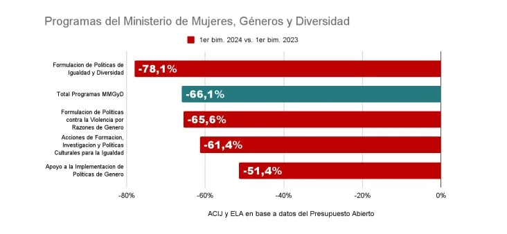 En concreto, el programa Acompañar (destinado a fortalecer la independecia económica de mujeres y LGBTI+ en situación de violencia de género) y la línea 144 (el centro oficial para asistir y asesorar a personas que atraviesan violencias) redujo su ejecución en un 78%. En el medio, hubo un femicidio cada 37 horas en el país y se contabilizan un total de 78 asesinatos por la violencia machista durante los primeros cuatro meses del 2024, de acuerdo al Observatorio "Ahora Que Sí Nos Ven".