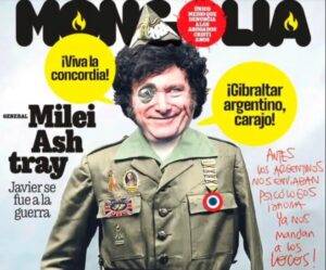 Time no es la única revista que le dedicó su portada. La publicación española Mongolia, del estilo de Humor, lo retrató vestido como el general José Millán Astray, famoso por su parche en el ojo y su grito de "Viva la muerte", y lo liquidó con una ironía feroz. "Los argentinos nos mandaban psicólogos, ahora ya nos mandan a los locos".