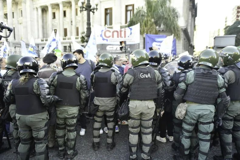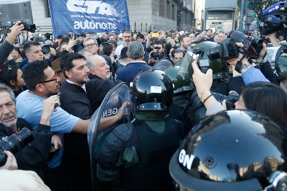 Mientras el Jefe de Gabinete, Guillermo Francos, realizaba su exposición ante los legisladores en el interior del Congreso, la Prefectura Naval Argentina desplegaba el protocolo antipiquetes en las calles. Los empujones a los manifestantes empezaron minutos antes de las 16 en Rivadavia y Combate de los Pozos. Unos instantes más tarde, los efectivos de las fuerzas de seguridad rociaron con gas lacrimógeno a las personas que protestaban por el veto del presidente Javier Milei a la ley de movilidad jubilatoria.