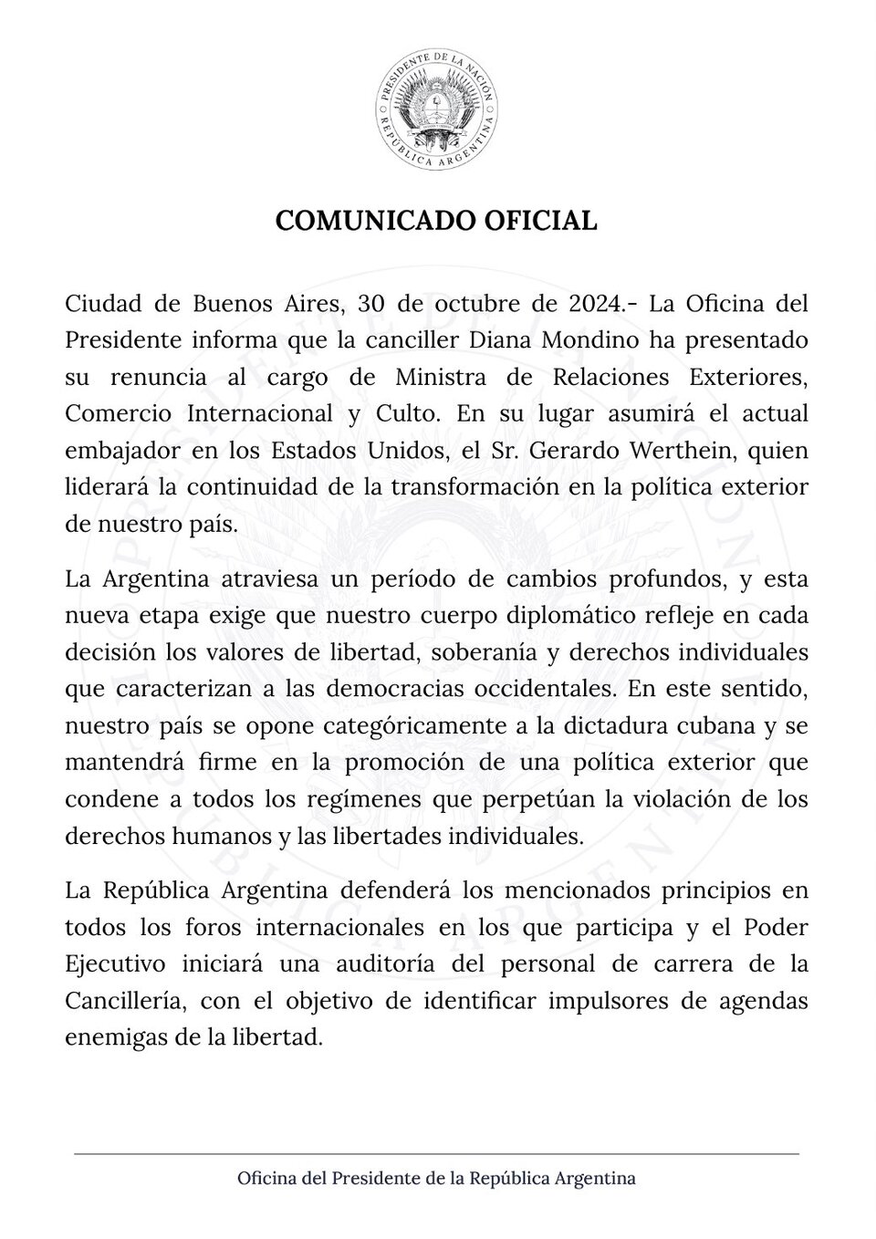 Además de confirmar que el actual embajador en Estados Unidos, Gerardo Werthein, reemplazará a Mondino al frente del Ministerio de Relaciones Exteriores, Comercio Internacional y Culto, el comunicado de la Oficina del Presidente precisa que "la Argentina atraviesa un período de cambios profundos, y esta nueva etapa exige que nuestro cuerpo diplomático refleje en cada decisión los valores de libertad, soberanía y derechos individuales que caracterizan a las democracias occidentales".