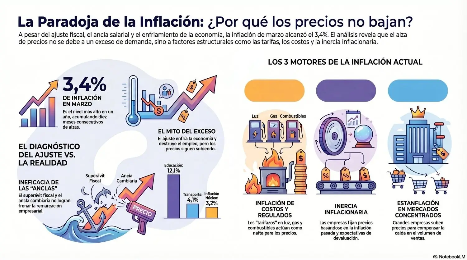 Si el salario sube por debajo de la inflación, si el tipo de cambio oficial lleva meses prácticamente estable, si el superávit fiscal se mantiene pese a las presiones sobre las cuentas públicas con caída de la recaudación impositiva en términos reales durante ocho meses consecutivos, y si la recesión del mercado interno frena la demanda que podría presionar sobre los precios, ¿por qué la inflación no baja?, ¿por qué en marzo de 2026 trepó a 3,4%, el nivel más alto en un año, más que duplicando el 1,5% de mayo pasado? y ¿por qué acumula diez meses de alzas consecutivas?