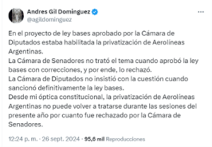 Por lo tanto, corresponde interpretar que la iniciativa privatizadora sobre Aerolíneas Argentinas fue rechazada por el Senado y, en los términos del artículo 81 de la Constitución, no puede ser tratada nuevamente en este periodo parlamentario en el Congreso. Lo cierto es que la Coalición Cívica y el PRO se hicieron “la gamba”: presentaron nuevos proyectos en la Cámara de Diputados. Mientras tanto, el Presidente firmó un DNU declarando la empresa sujeta a privatización, en un verdadero mamarracho jurídico que comienza a hacerse costumbre en el gobierno de La Libertad Avanza.